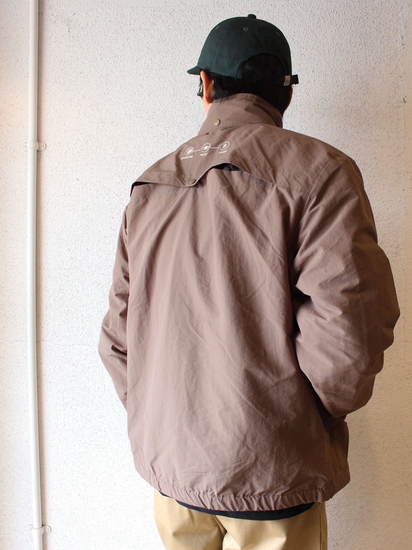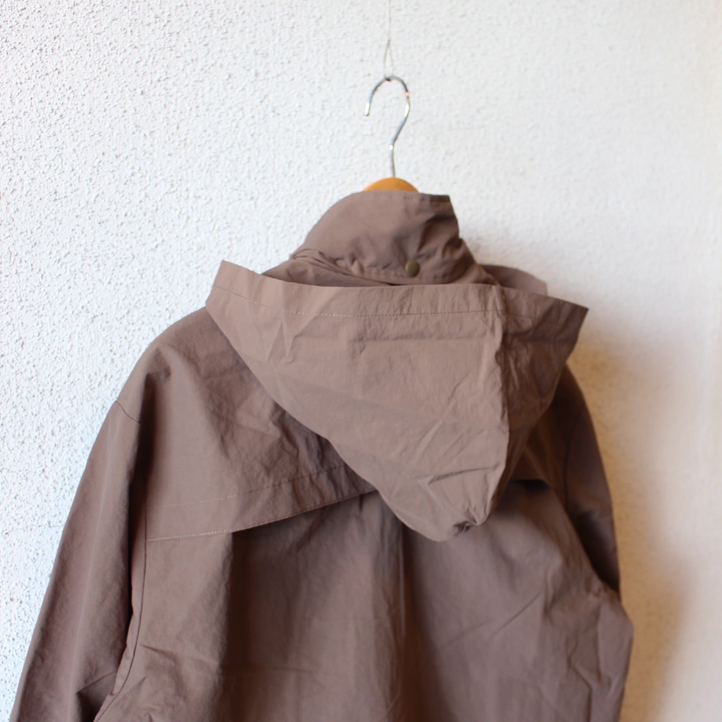 裾はドローコード仕様でシルエットの調整が可能。襟にはフードを収納できるので2WAYで着用できます。