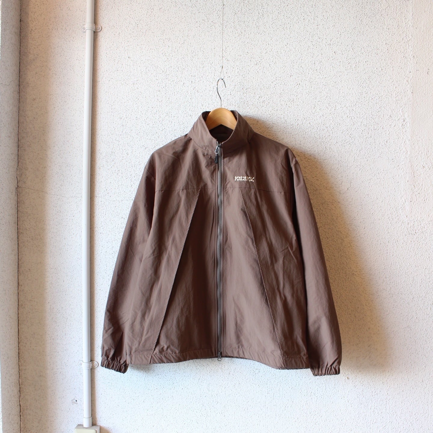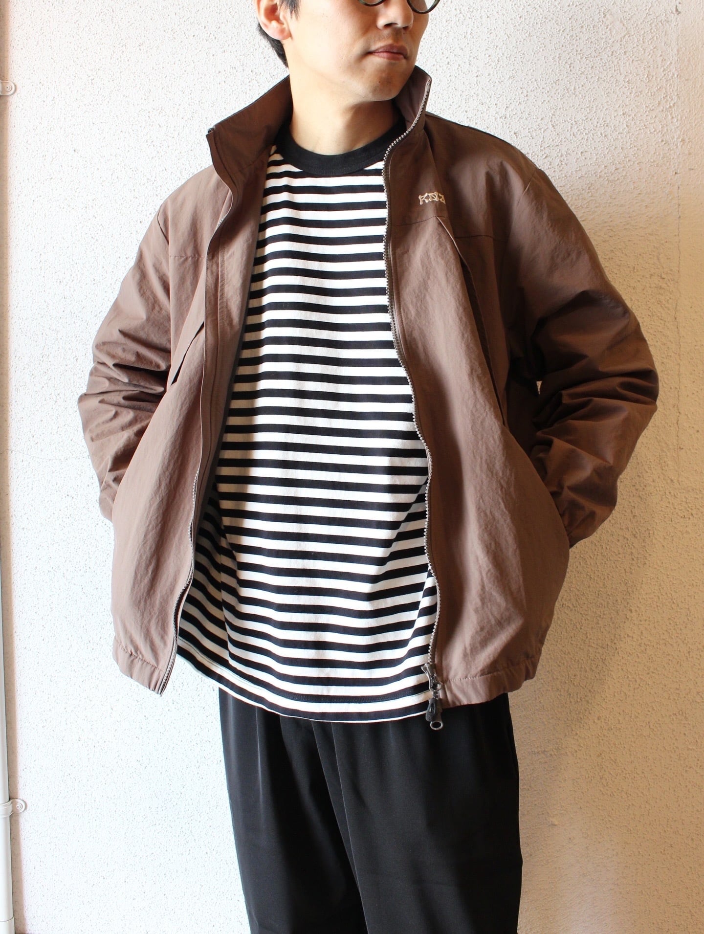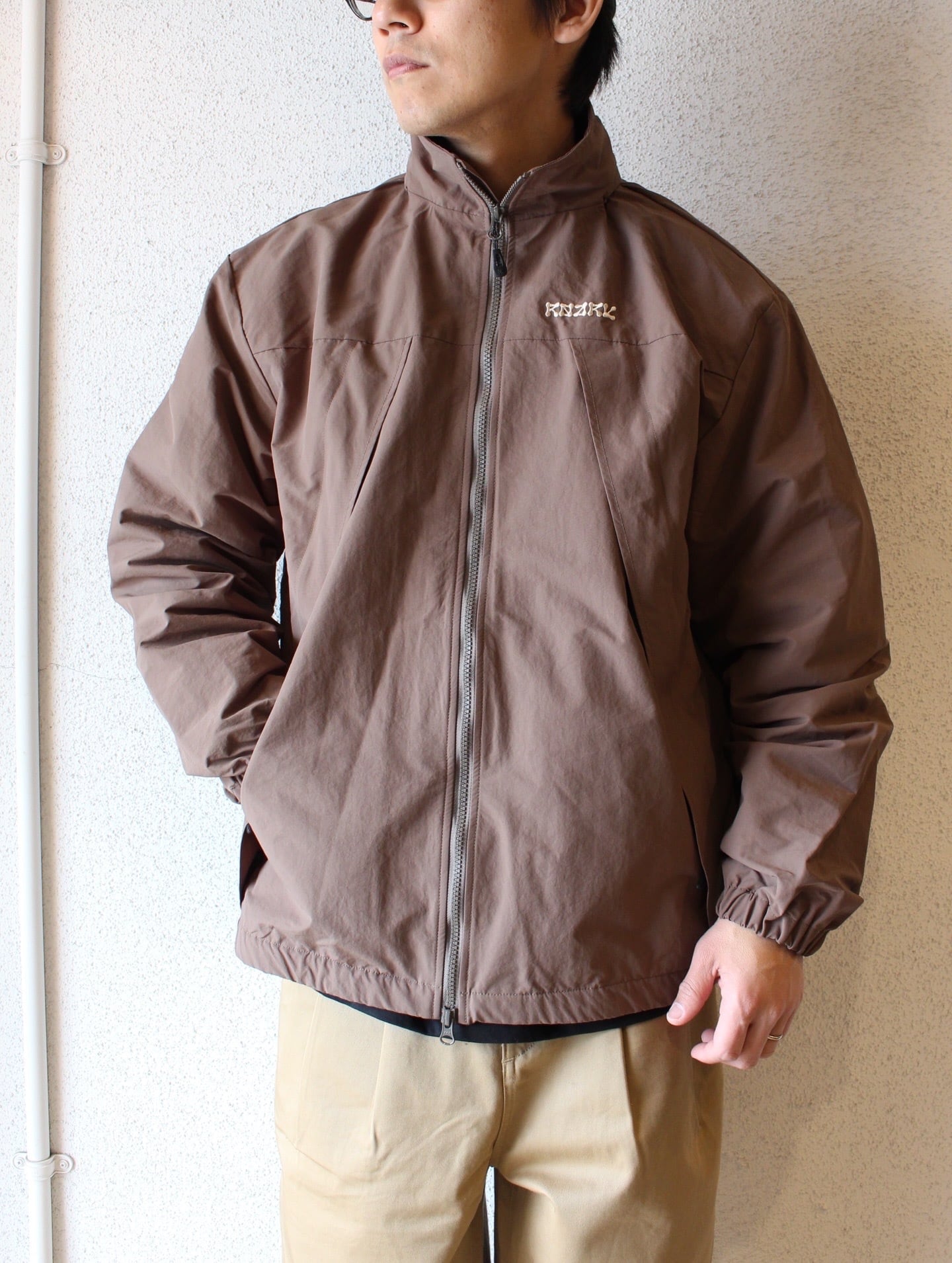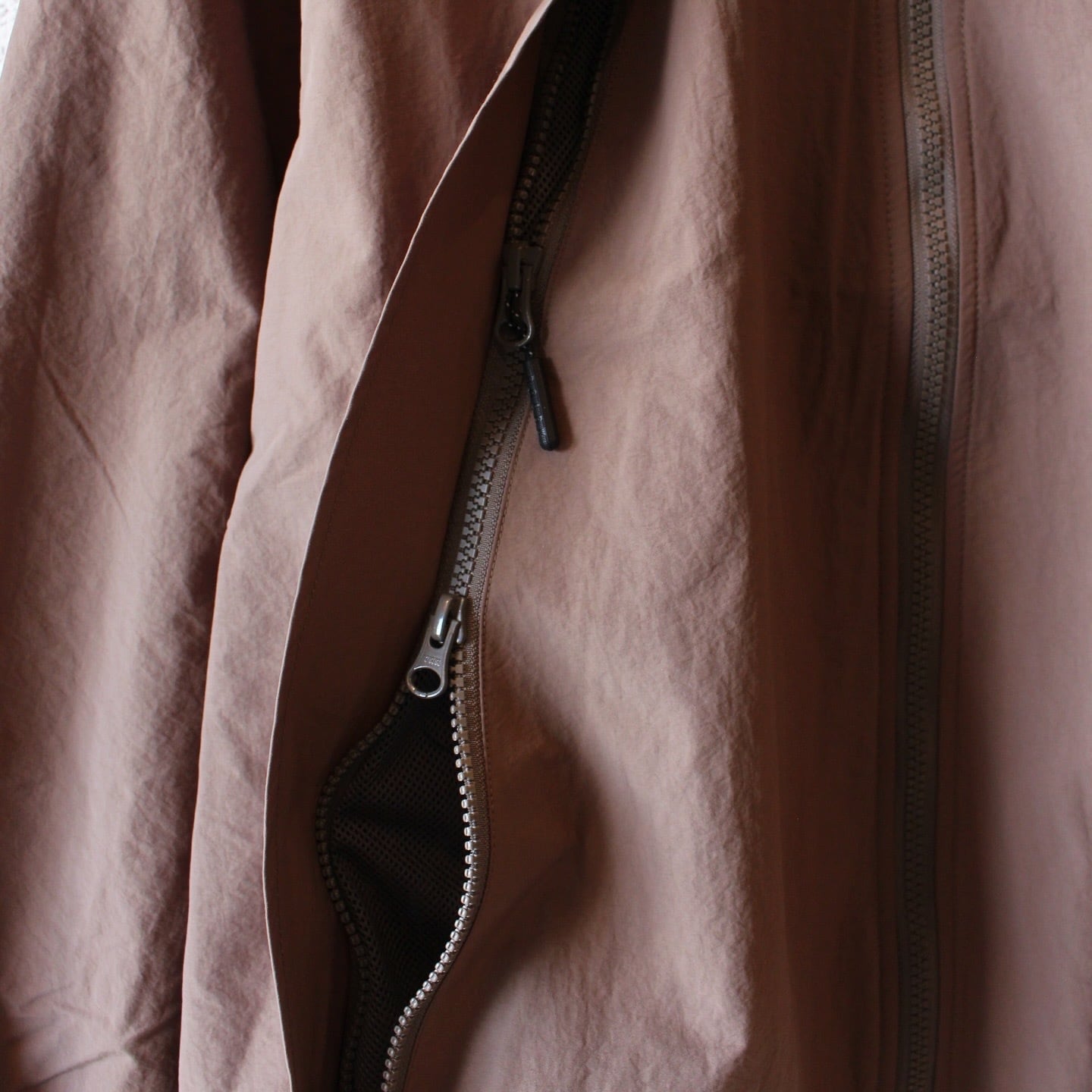 独特のシワ感と軽さのあるナイロン生地を使用し、身幅や着丈がゆったりとしたシルエットでボディに配した大きなダイアゴナルジップが特徴的です。