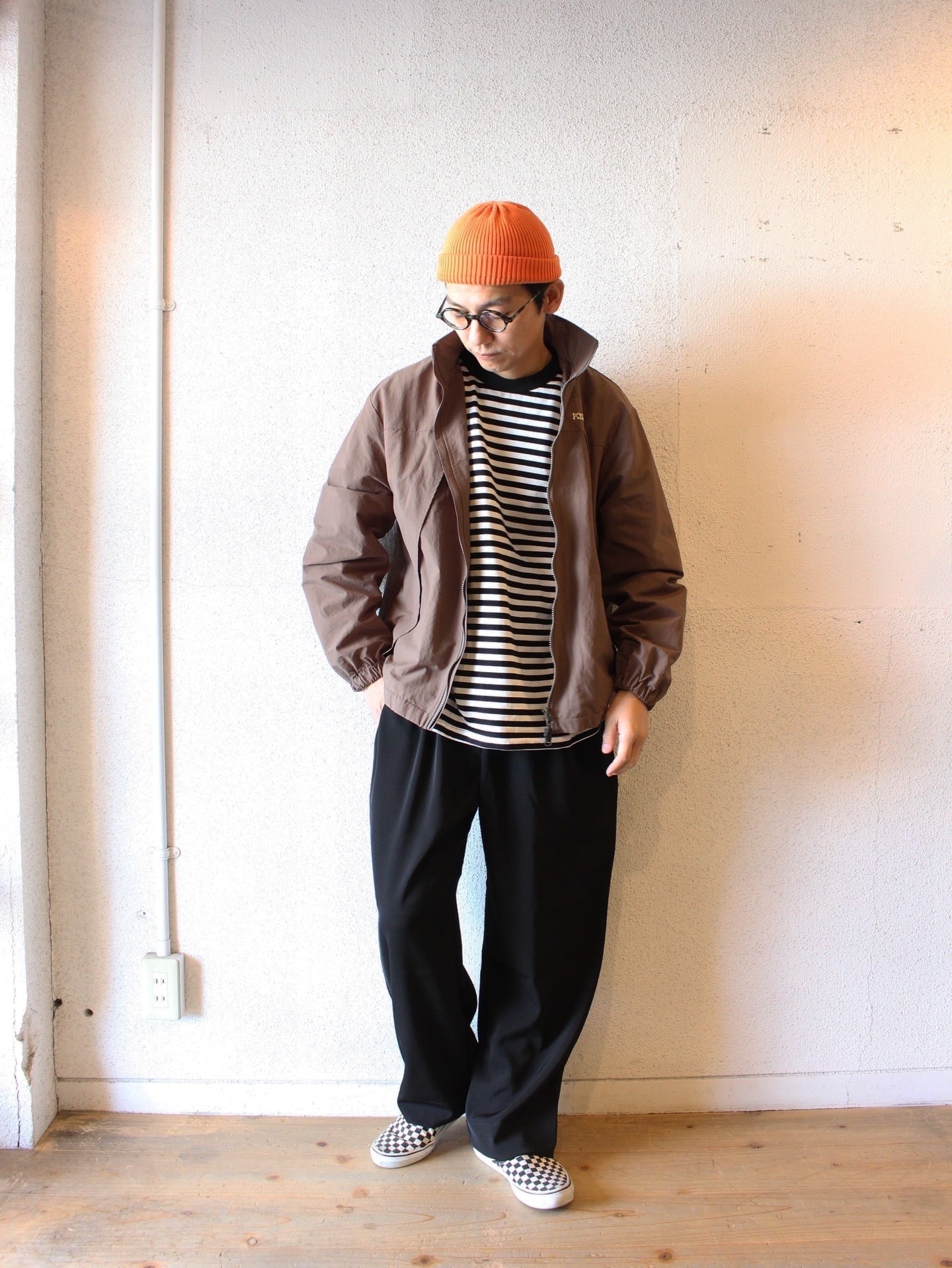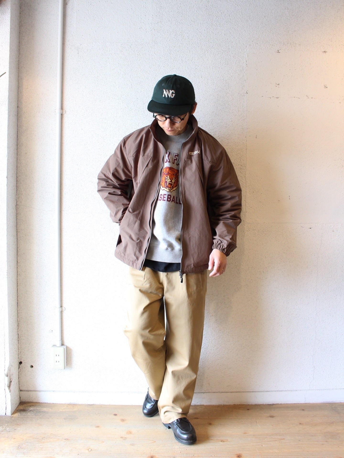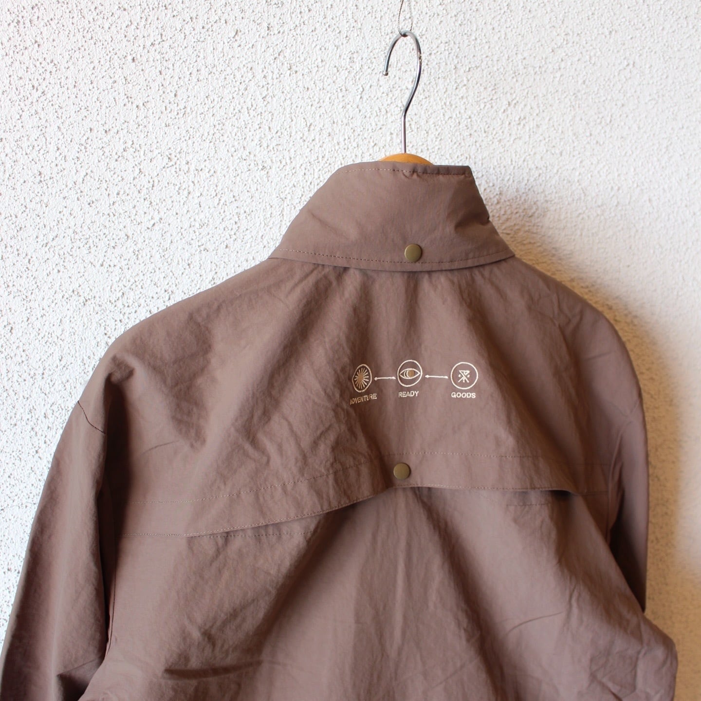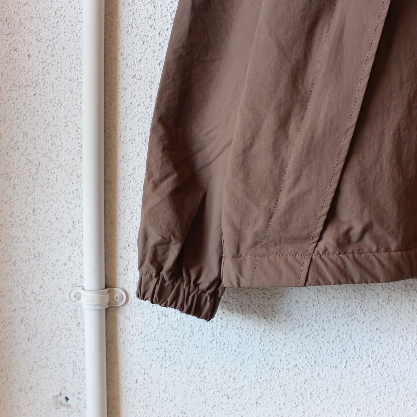 独特のシワ感と軽さのあるナイロン生地を使用し、身幅や着丈がゆったりとしたシルエットでボディに配した大きなダイアゴナルジップが特徴的です。