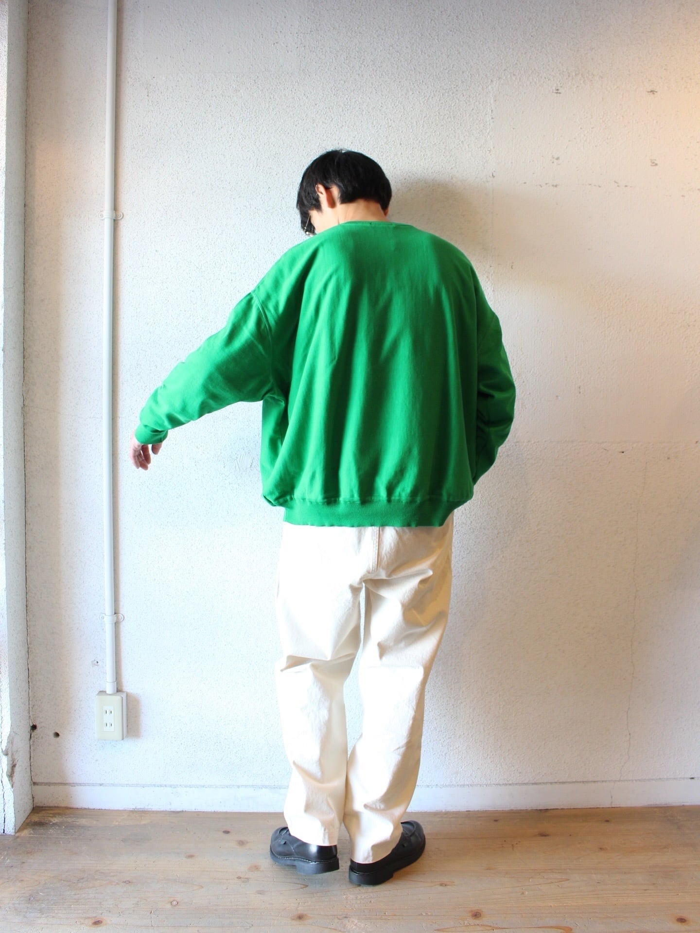 肩が落ちたドロップショルダーに、身幅はたっぷりと