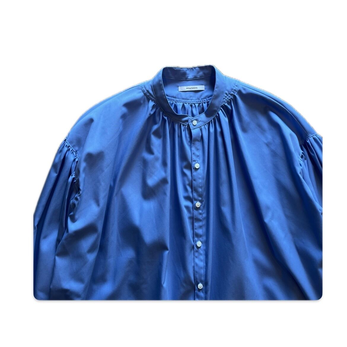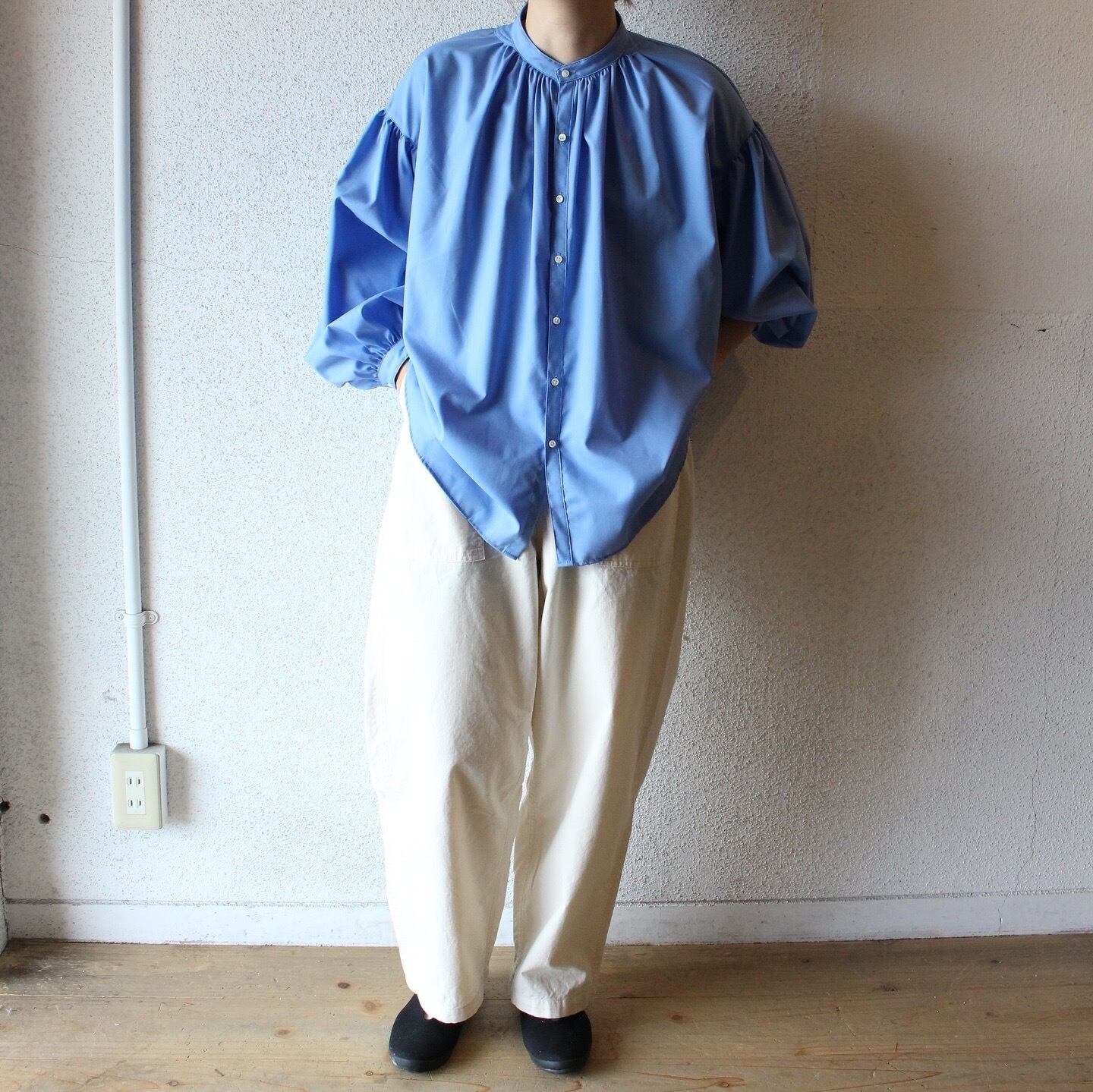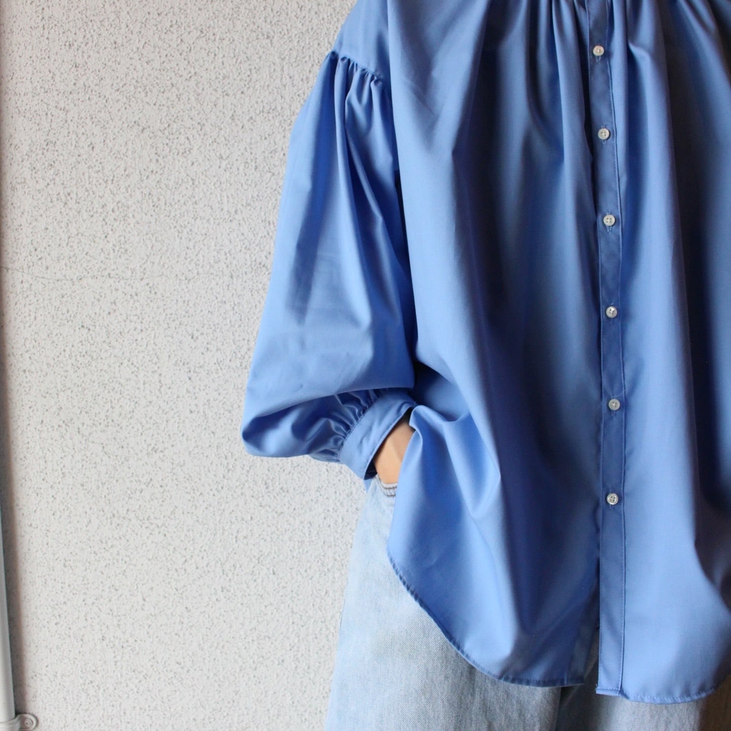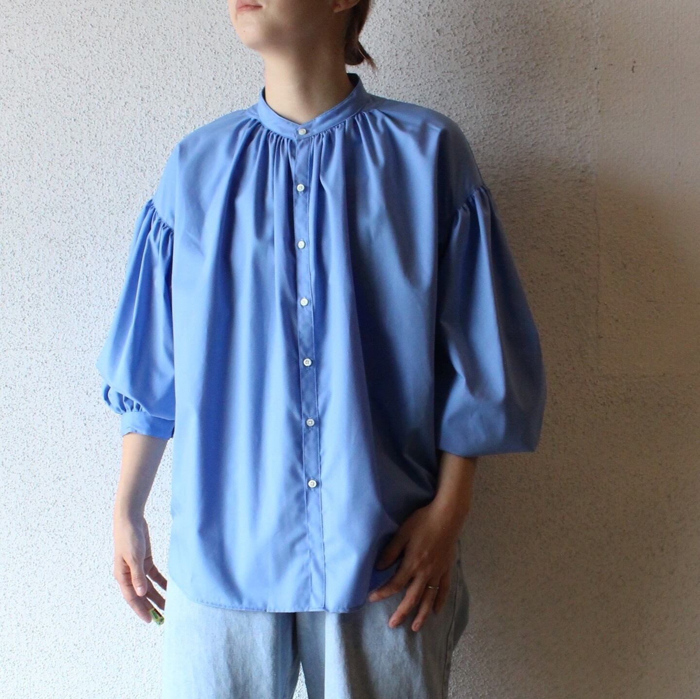 バンドカラーに肩を落とし、衿まわりから後ヨーク、袖口にたっぷりとギャザーを寄せることで、ふんわりと柔らかなシルエットに
