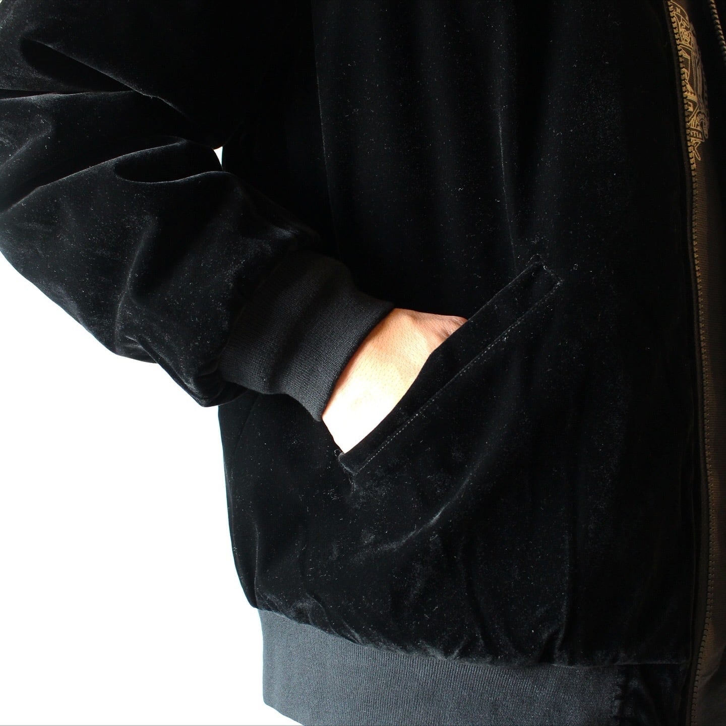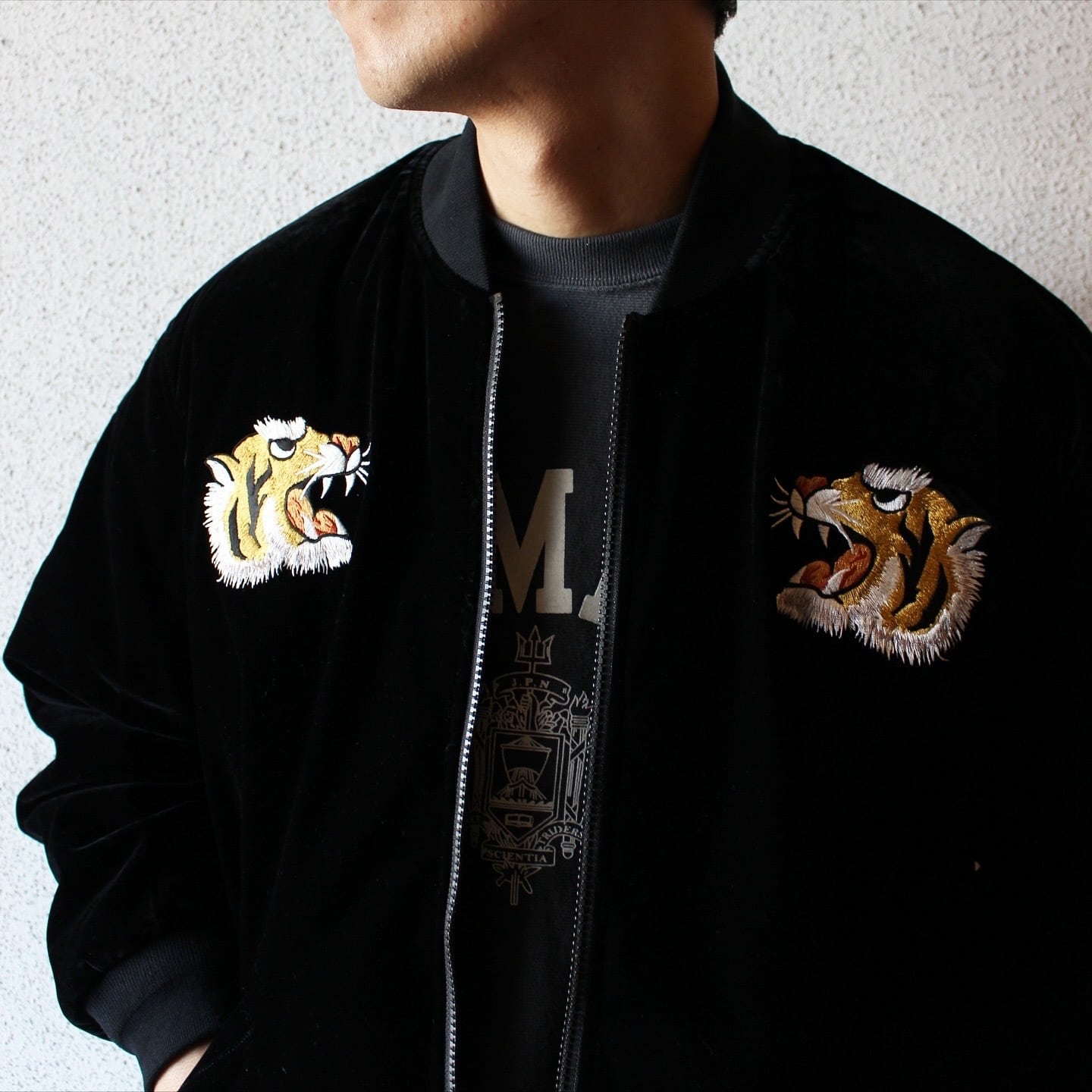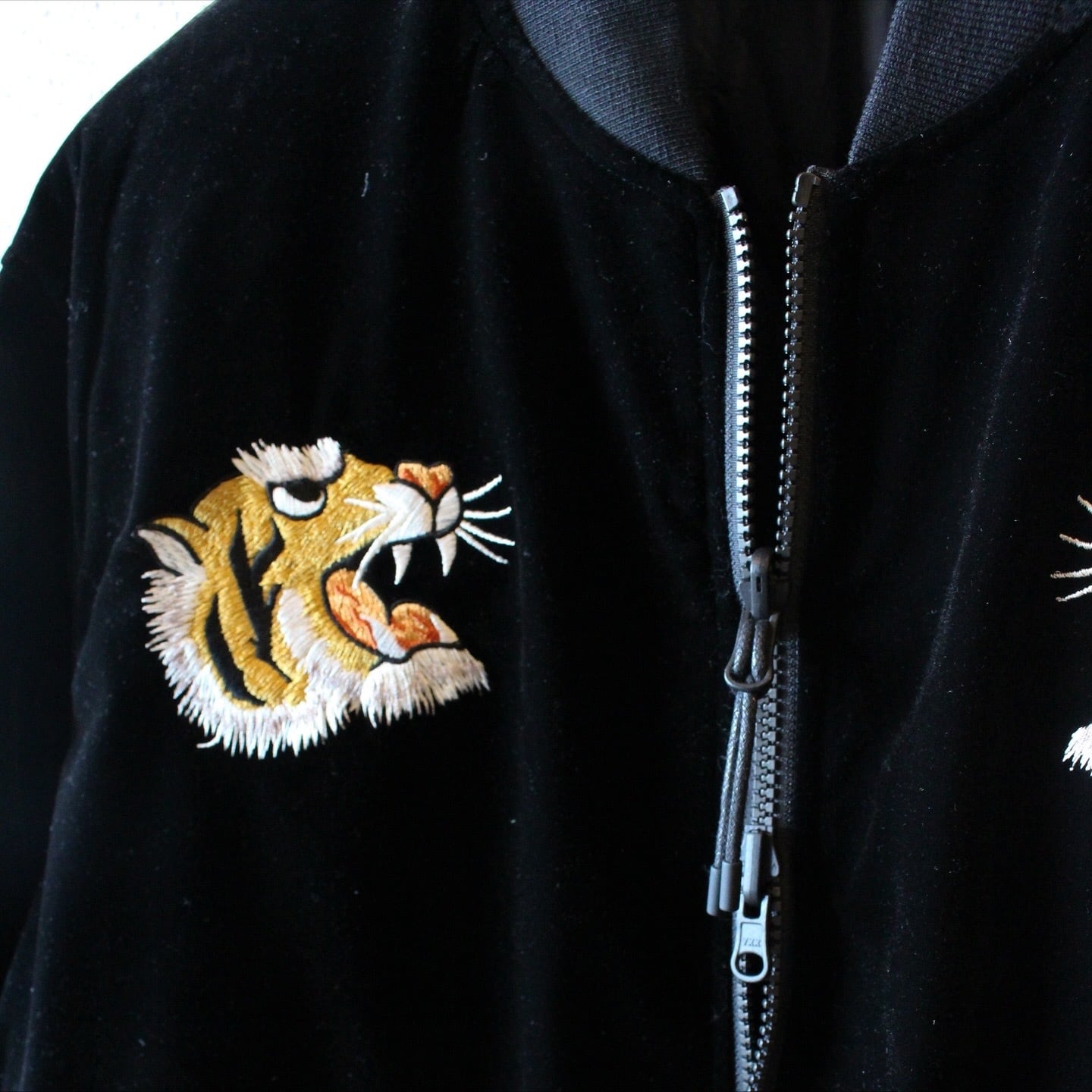 表側は毛羽立ちのあるベロア生地に、前後へ手の込んだスカジャン風の刺繍を施したデザイン。