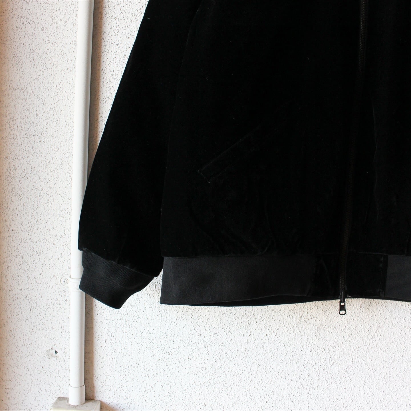 光沢のあるベロア生地が程よく上品で、インナーにスウェットを合わせたカジュアルなスタイルも◎