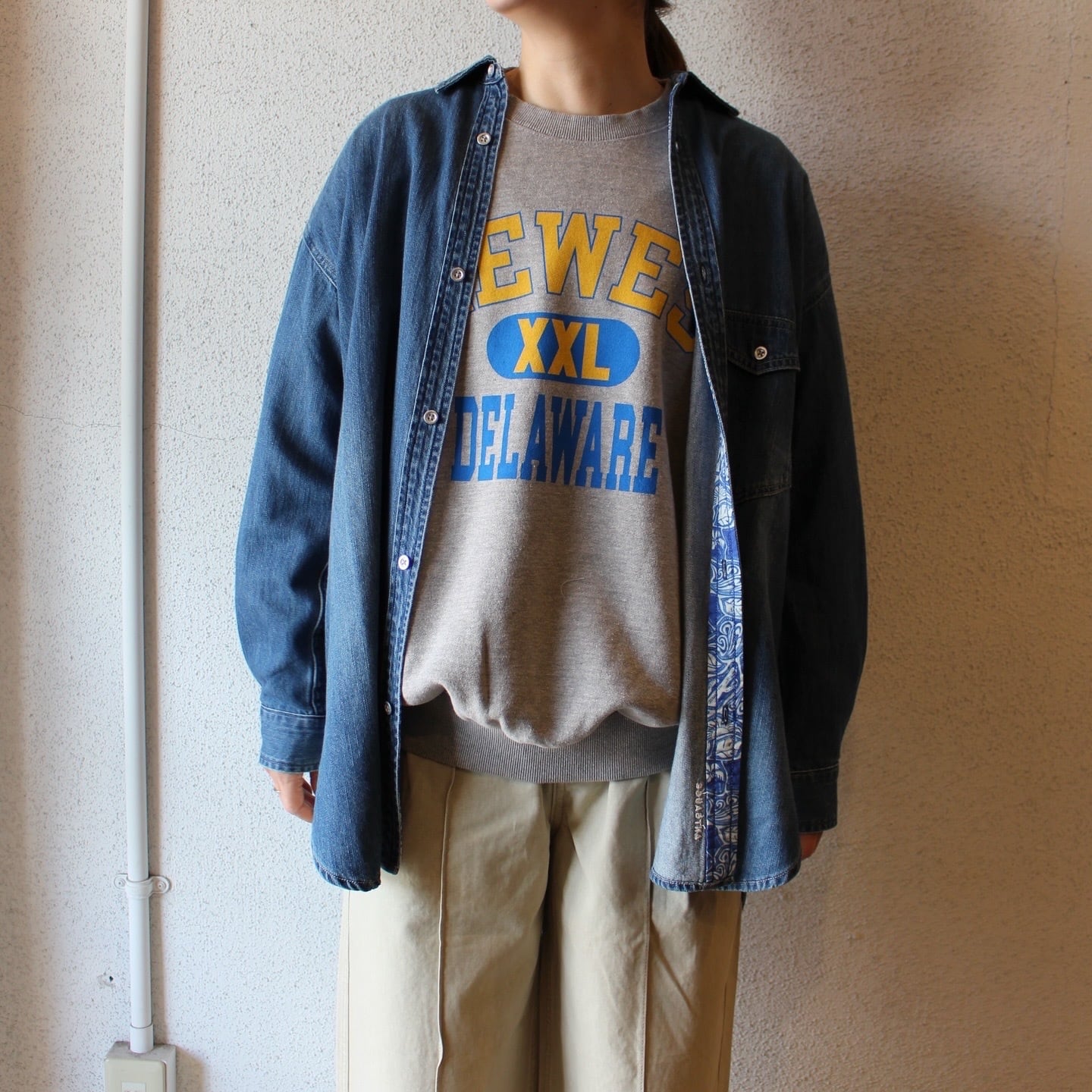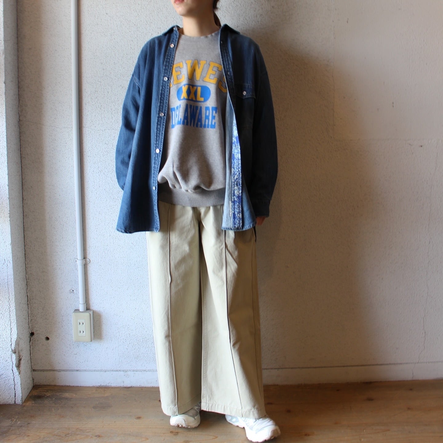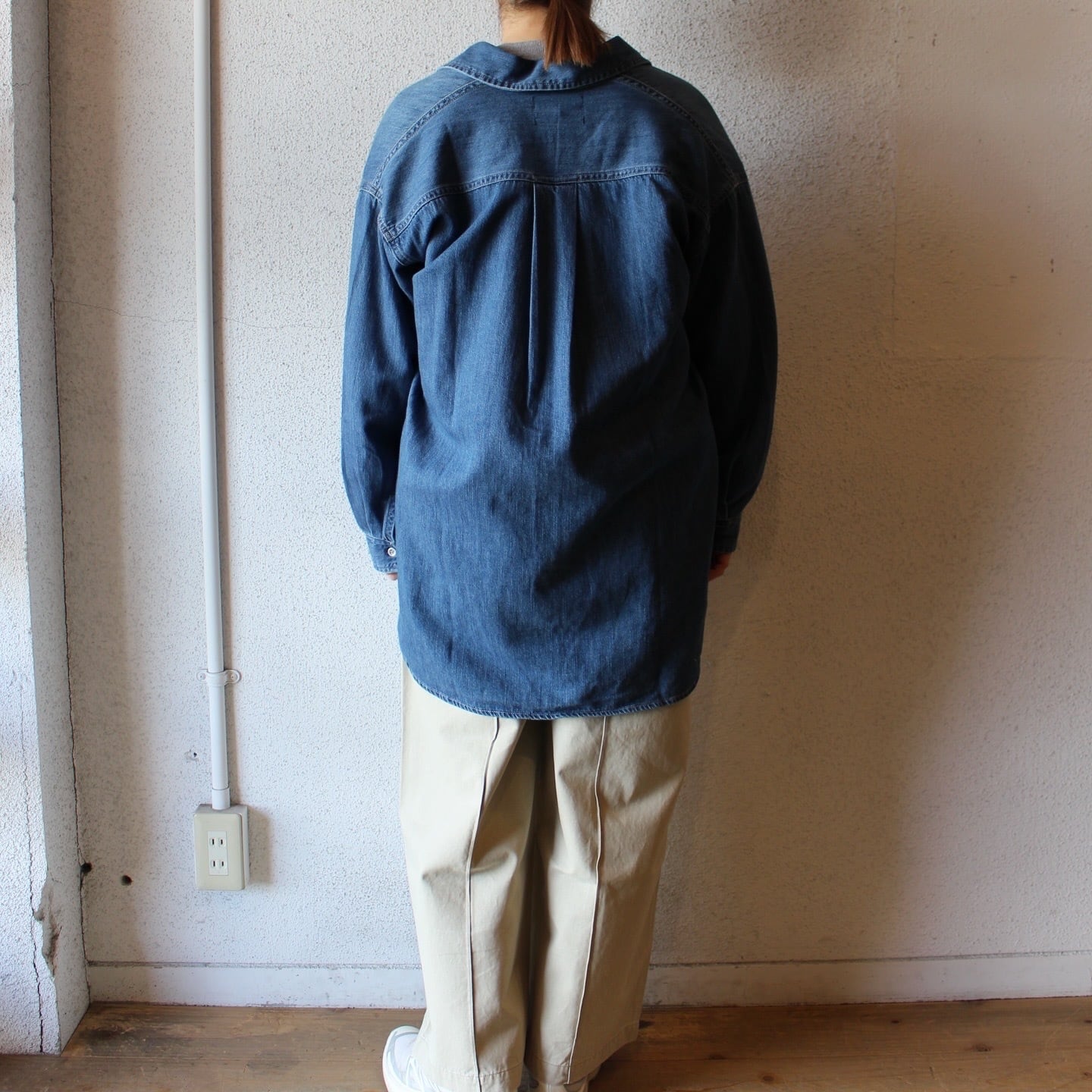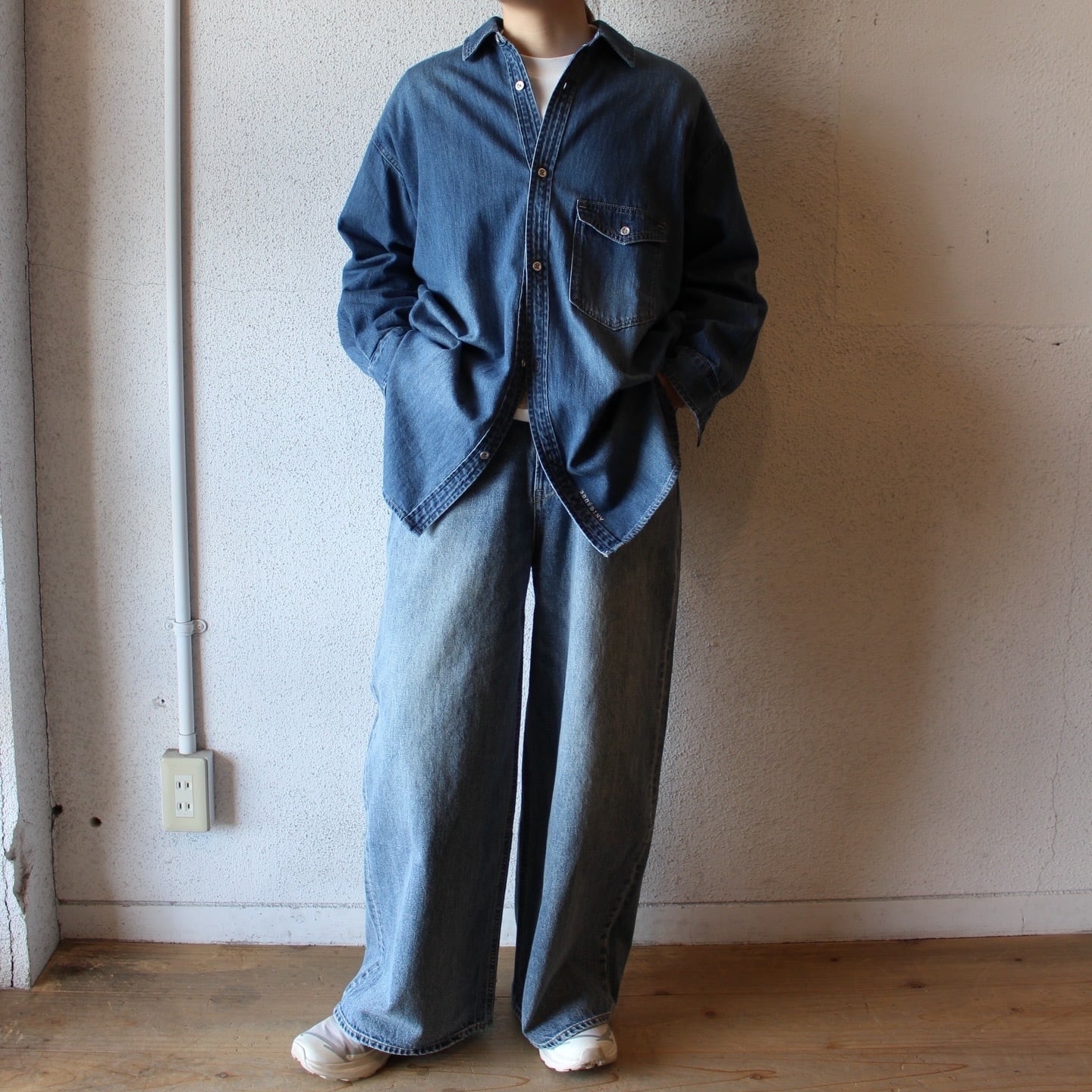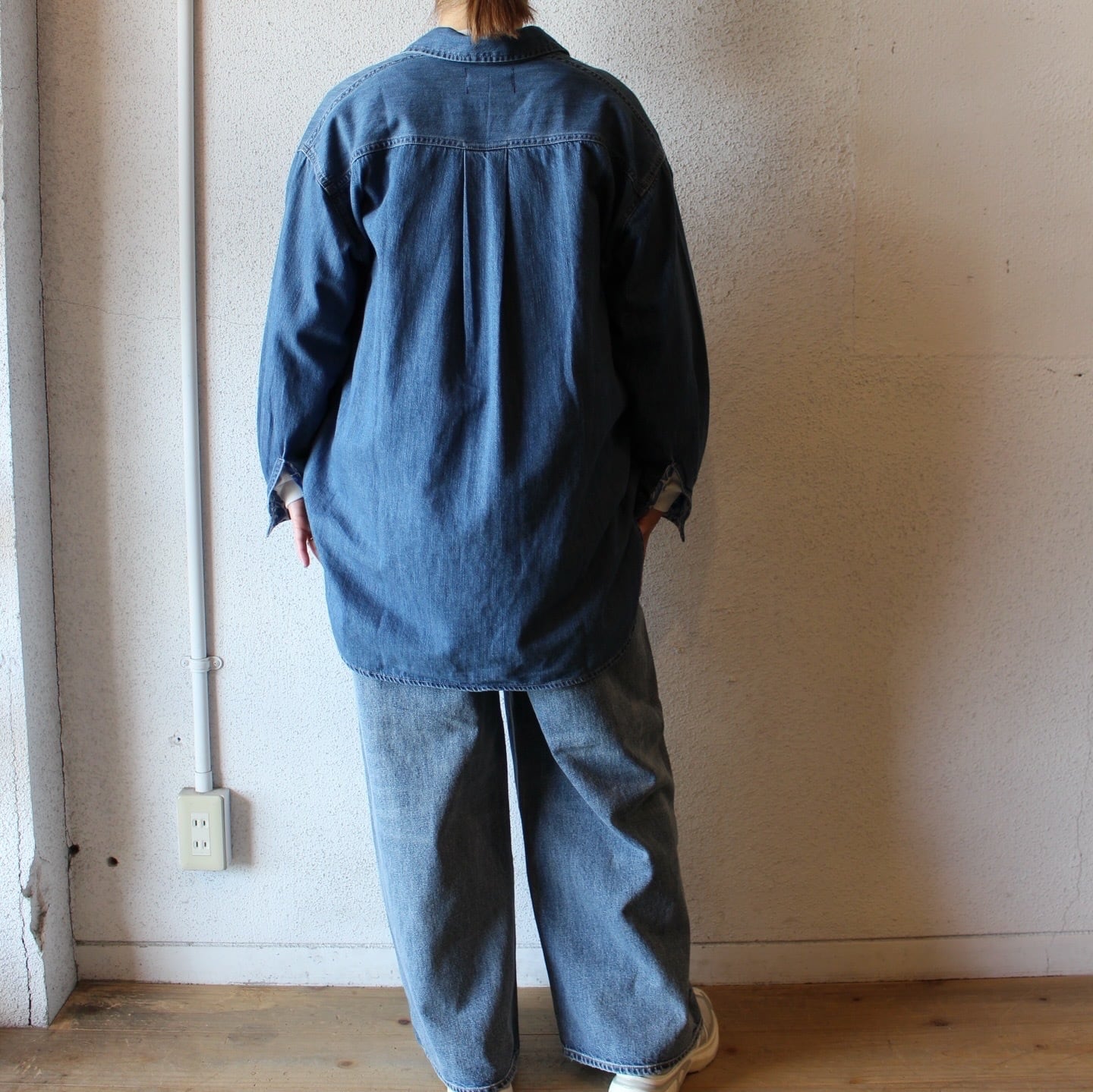 ライトオンスデニムならではの落ち感があり、ゆったりしたサイズ感でも広がりすぎず、自然とすっきりとした印象で着こなせます。