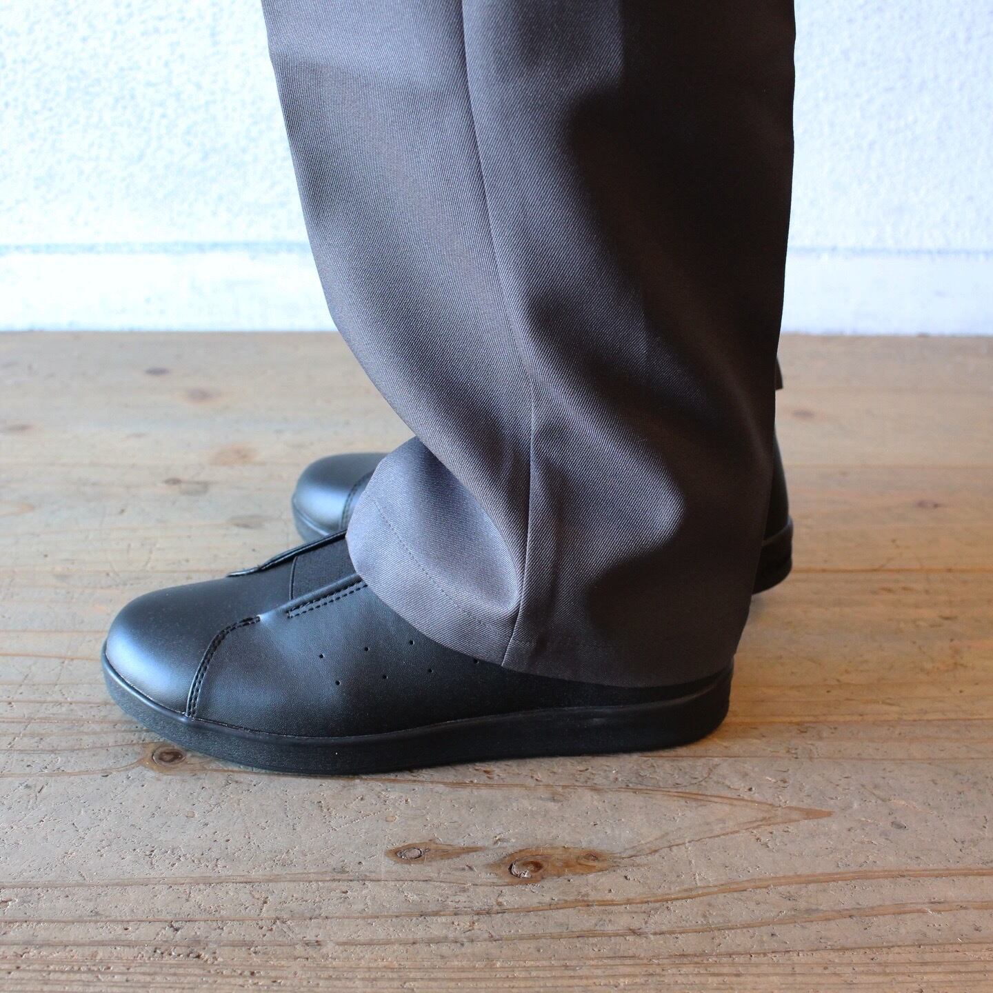 厨房や食品工場で使われるキッチンシューズをデイリーユースに。油や水に濡れた床面に吸い付くマルチストッパーソールや手入れが楽なアッパー素材を採用。ミニマルに仕上げたコートタイプ。